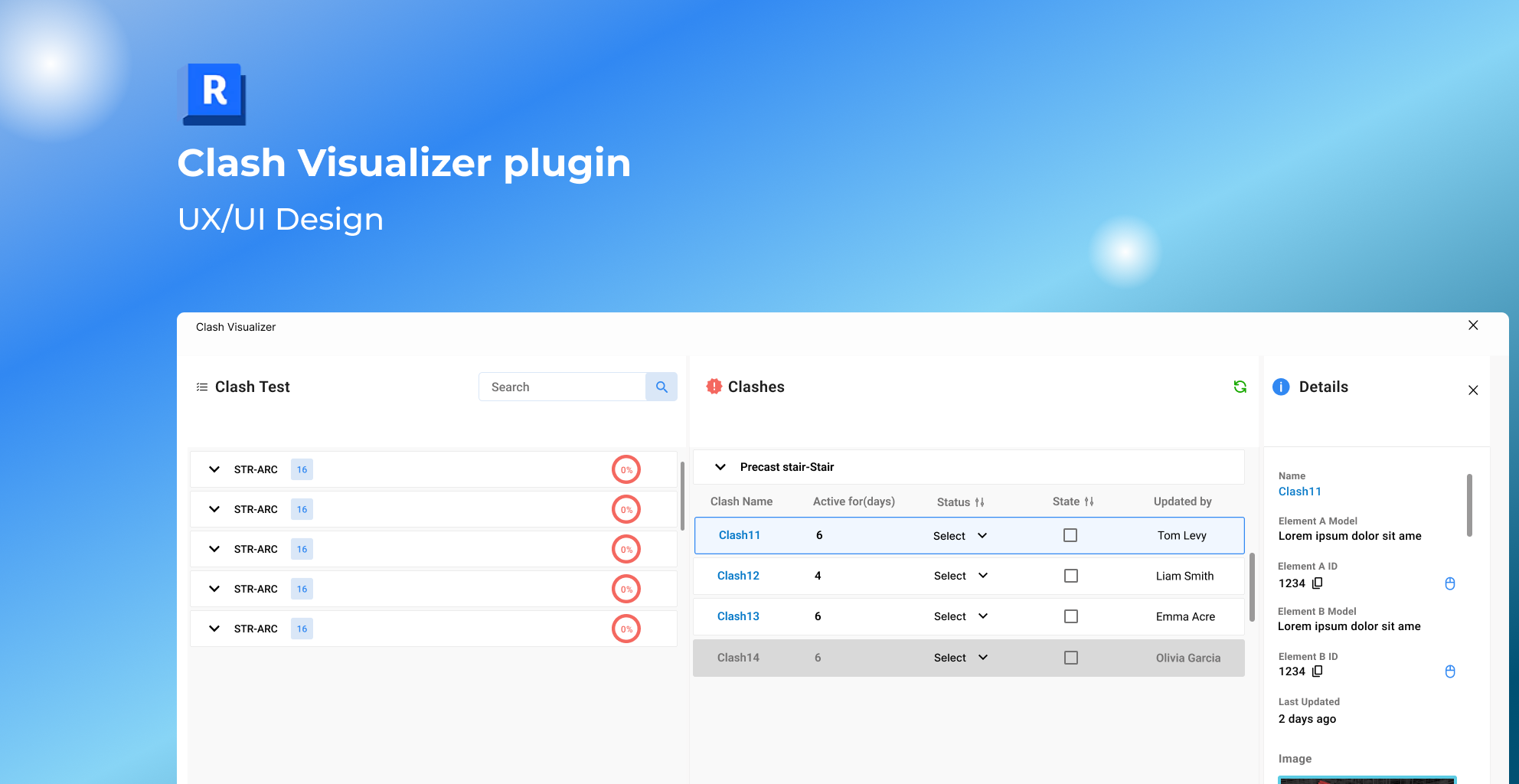 Clash Visualizer is a Revit software plugin used by the architects and engineers of the STUDIO IN-EX company, to detect buildings’ clashes after 3d modeling. The UX/UI design was done independently by me. It has already been developed and integrated to Revit by a software developer.